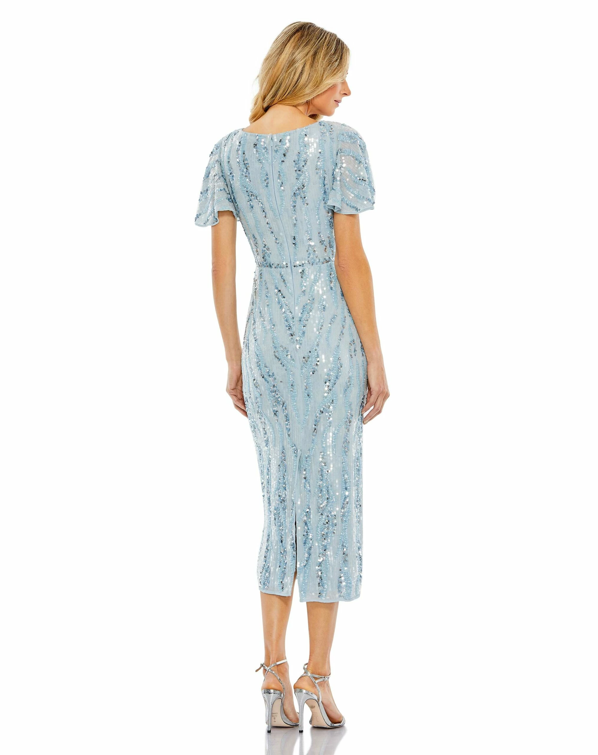 Sequined V Neck Flutter Sleeve Tea Length Dress