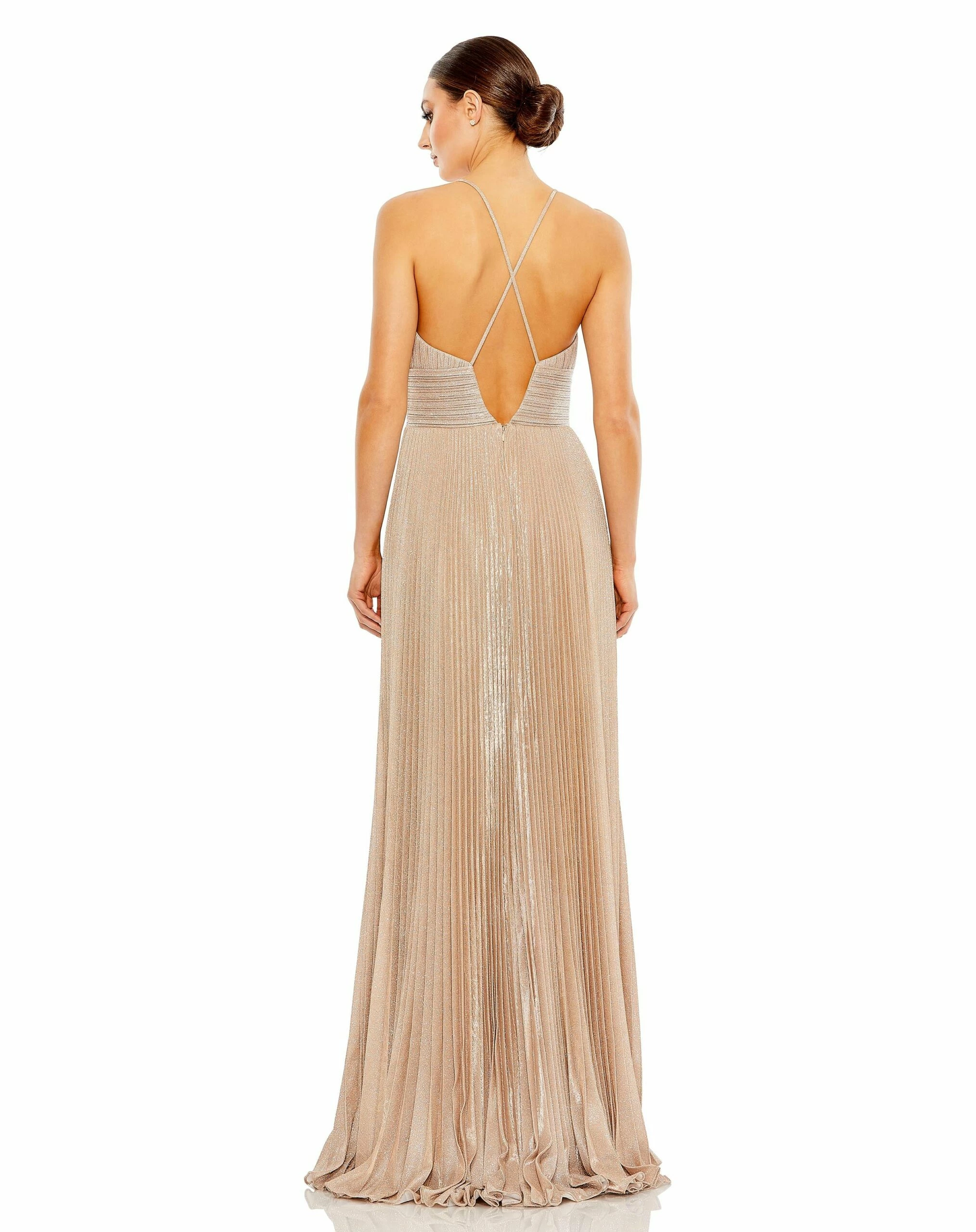 Nothing outshines the lady in this metallic jersey gown sprinkled with brilliant silver glitter. Cut in a swishy A-line silhouette with a mesh inset at the neckline, the flattering pleated gown is perfect for moving, grooving, and making fabulous lasting impressions.