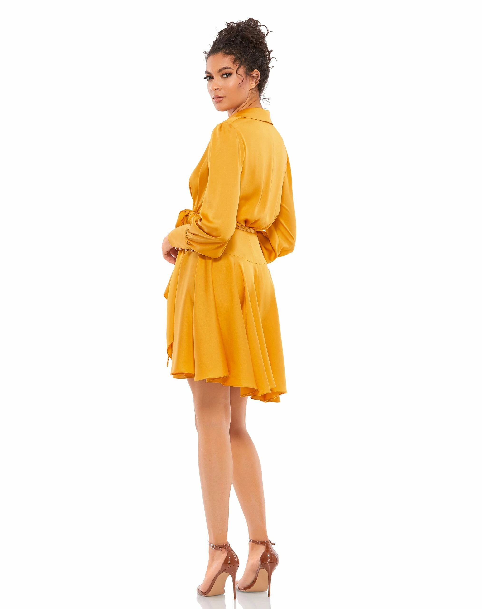 Chic long-sleeved wrap dress with a shawl lapel and flirty pleated hi-low skirt.