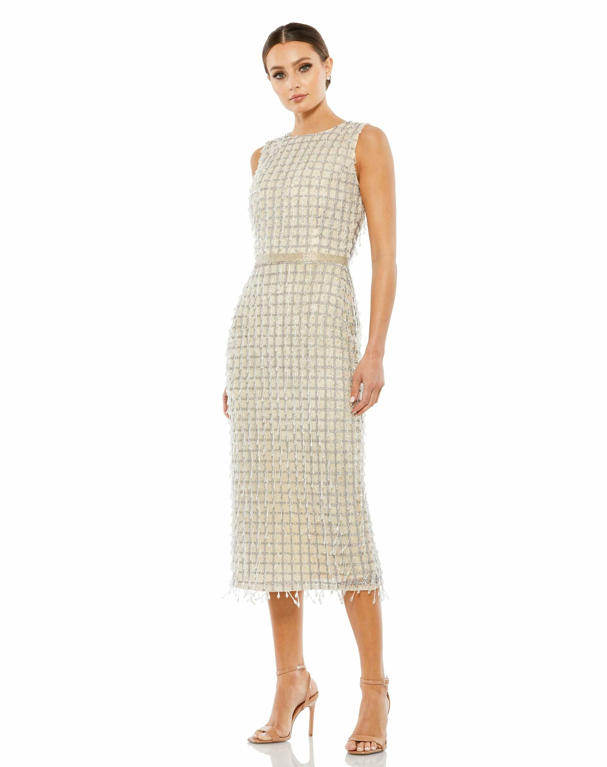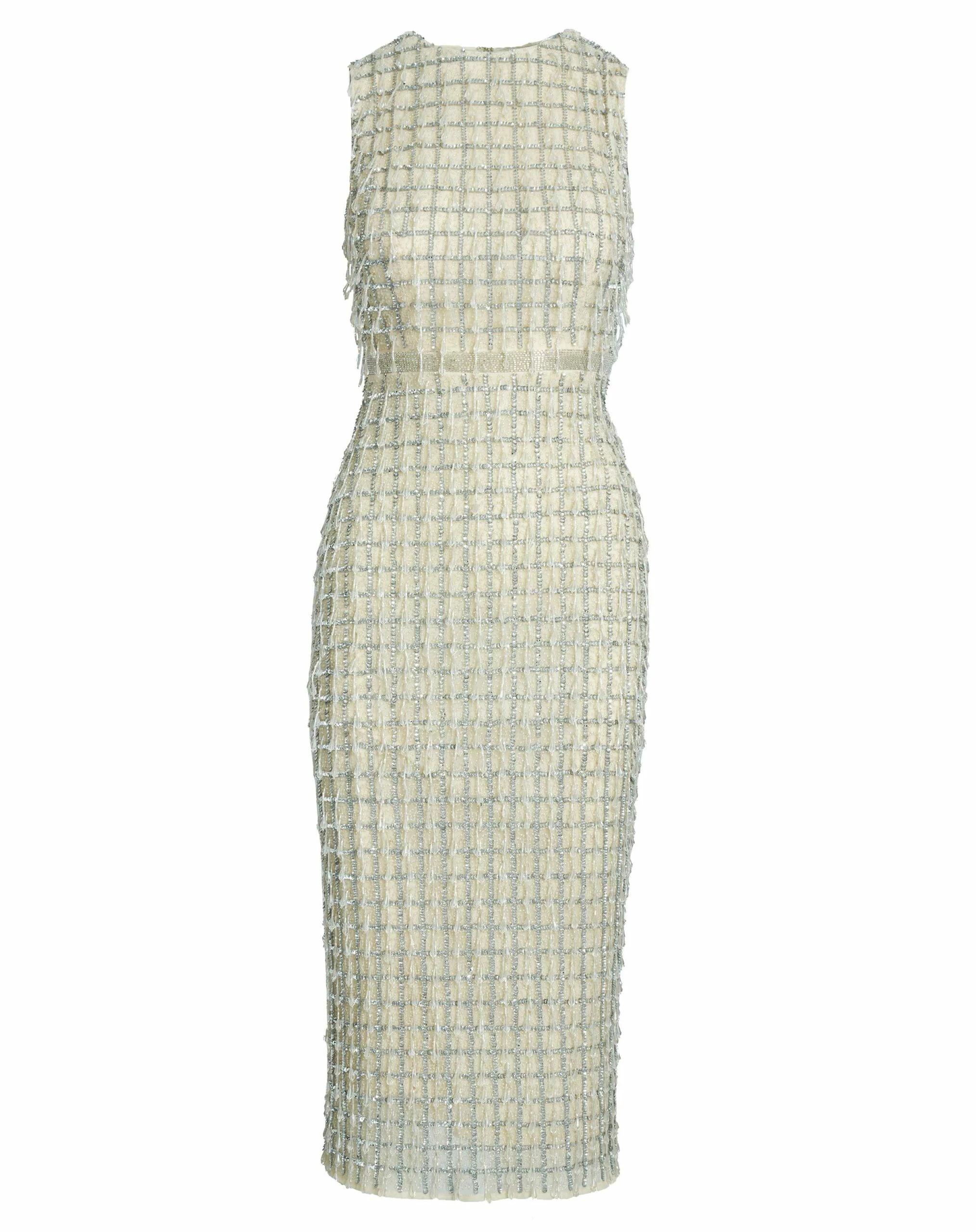 A flirty take on the polished sheath, this striking midi dress is dripping with faceted bead fringe. The dazzling dress is an innovative and chic way to don sparkle, cut in a sleek, fitted shape and patterned with sequin checks filled in with pearlescent beads. Wear it for weddings, work events or cocktail parties.