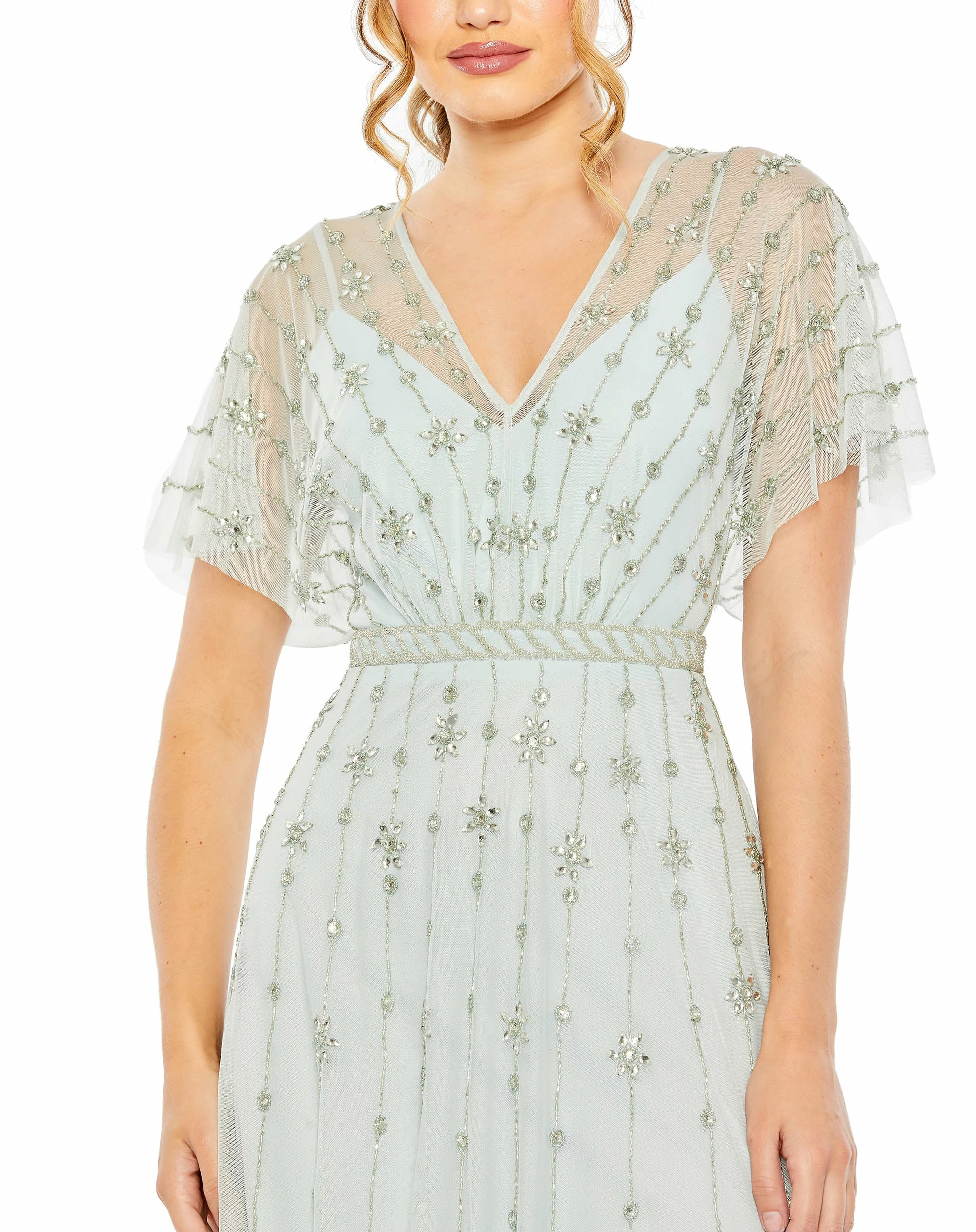 V Neck Embellished Flutter Sleeve A Line Gown
