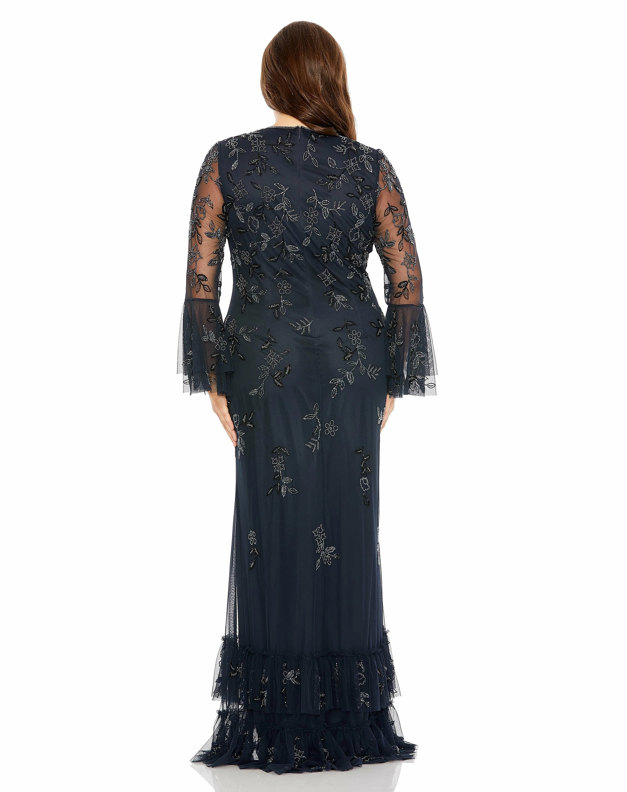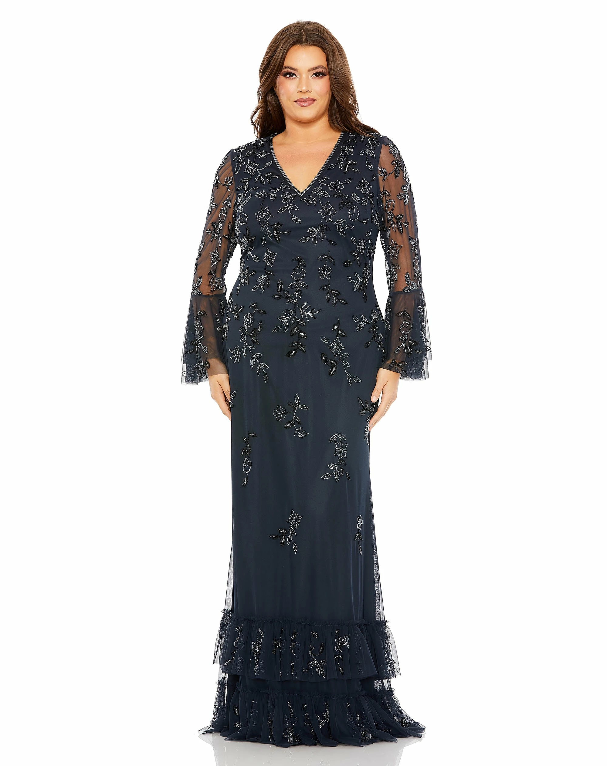 V Neck Embellished Flutter Tiered Long Sleeve Gown