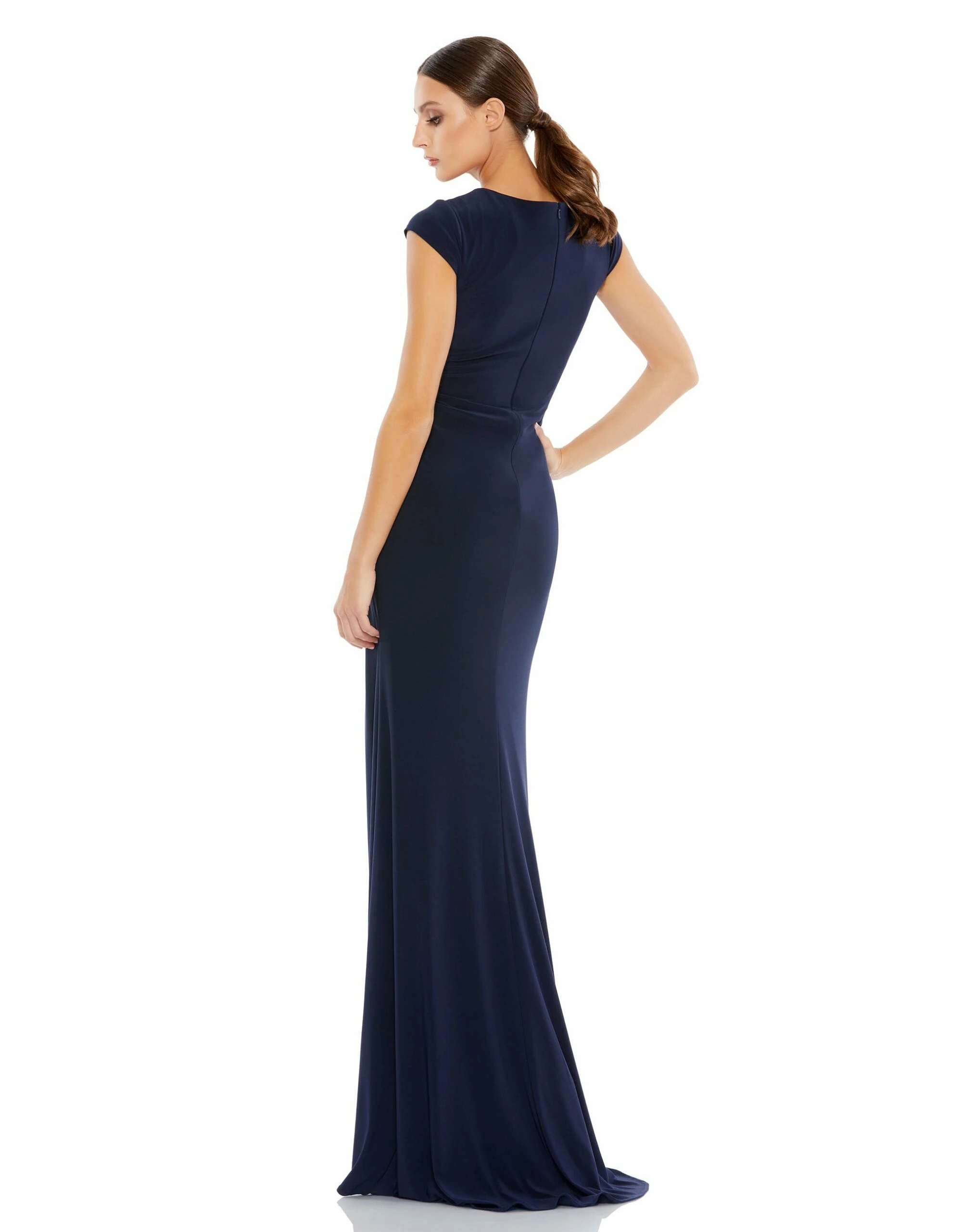 Chic stretch jersey cap sleeve gown with a v-neckline, ruched bodice, and a thigh-high slit.